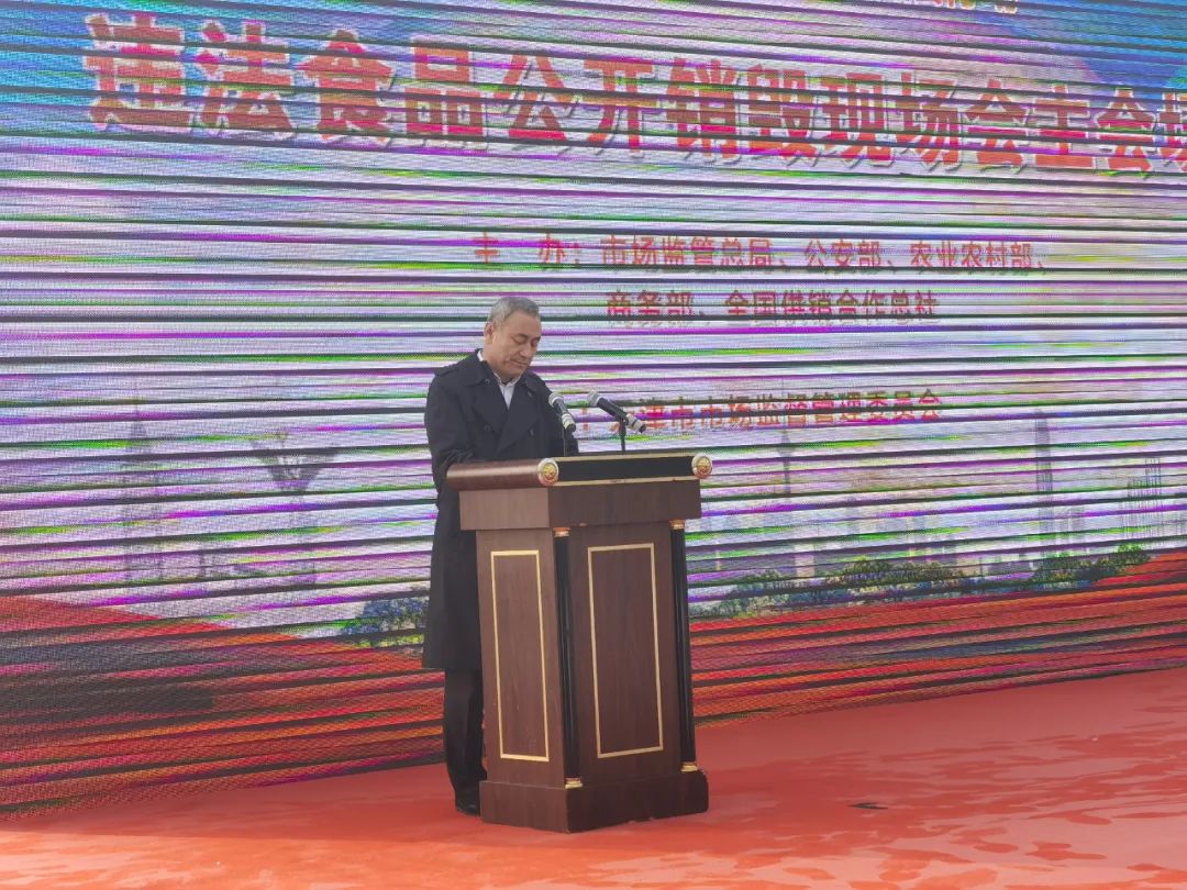 今日,由國家市場監(jiān)管總局、公安部、農業(yè)農村部、商務部、中華全國供銷合作總社五部門聯(lián)合主辦的“農村假冒偽劣食品專項執(zhí)法行動違法食品公開銷毀現(xiàn)場會”以視頻連線方式在北京召開,天津食品集團作為唯一一家企業(yè)代表受邀參加天津主會場會議,集團黨委副書記、總經理趙國榮出席并代表集團發(fā)言。