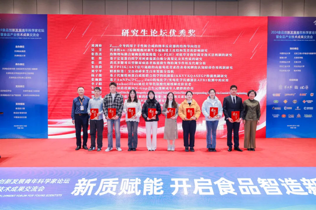 開幕式上,北京工商大學(xué)王彥波教授、大連民族大學(xué)曹際娟教授為8位研究生代表頒發(fā)2024食品創(chuàng)新發(fā)展青年科學(xué)家論壇“研究生論壇優(yōu)秀獎(jiǎng)”。