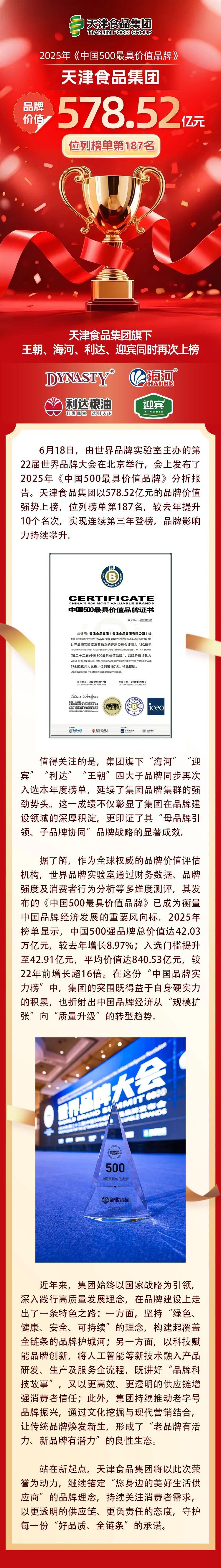 集團(tuán)連續(xù)三年榮登“中國500最具價(jià)值品牌”榜單 旗下王朝、海河、利達(dá)、迎賓再次同時(shí)上榜