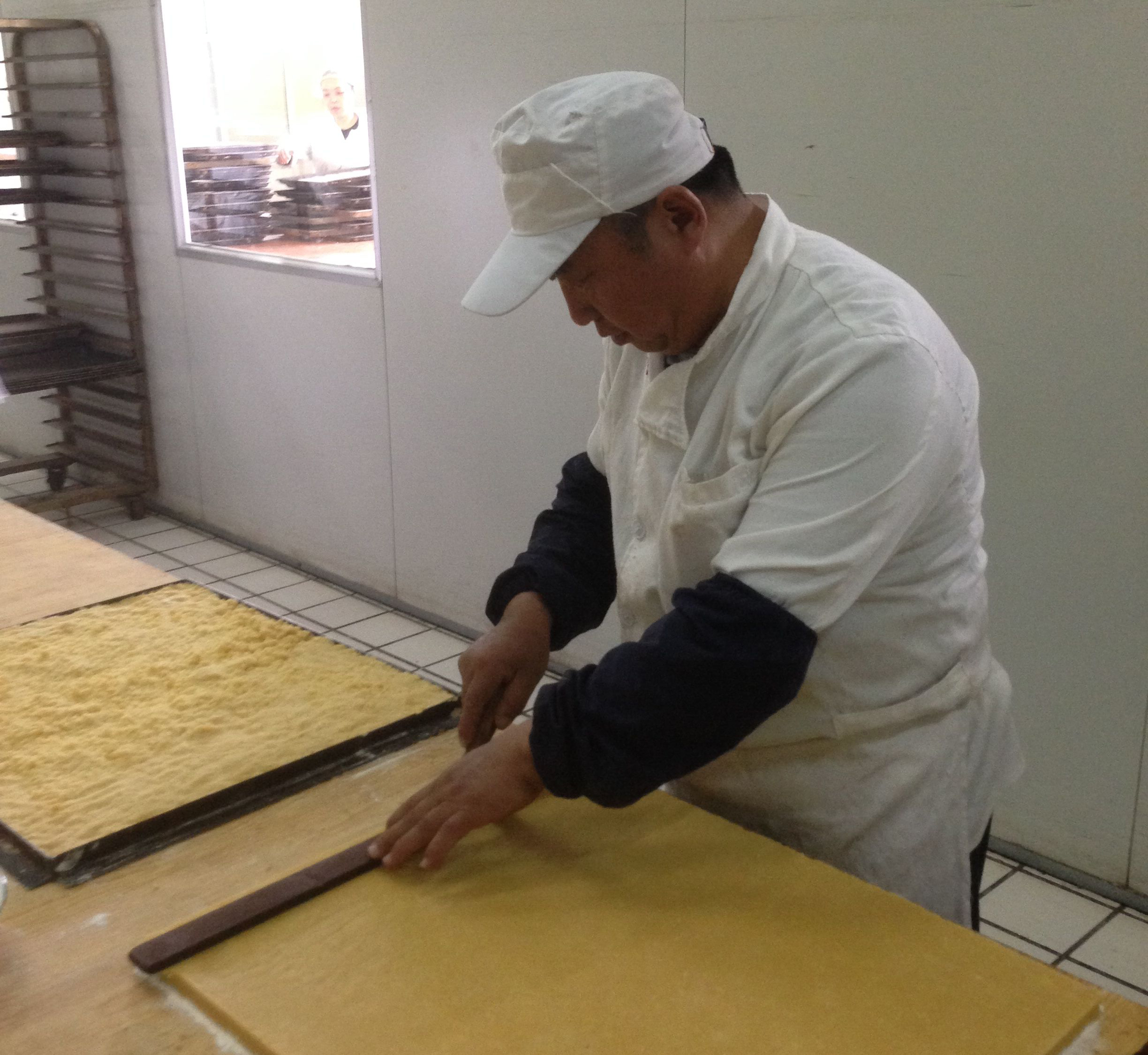 “蘇打餅干整個制作要花費(fèi)6個多小時,其中醒面就占了將近4個多小時。這是一種清酥面的搟法,面皮和完以后裹上油之后再搟,所以要求面必須醒到位。另外需要注意的就是搟面的手法。搟制的過程中,面皮擱到桌面上要能清晰地看到面皮上的紋路,而且要均勻。”賈少春說起“蘇打餅干”的制作工藝如數(shù)家珍。