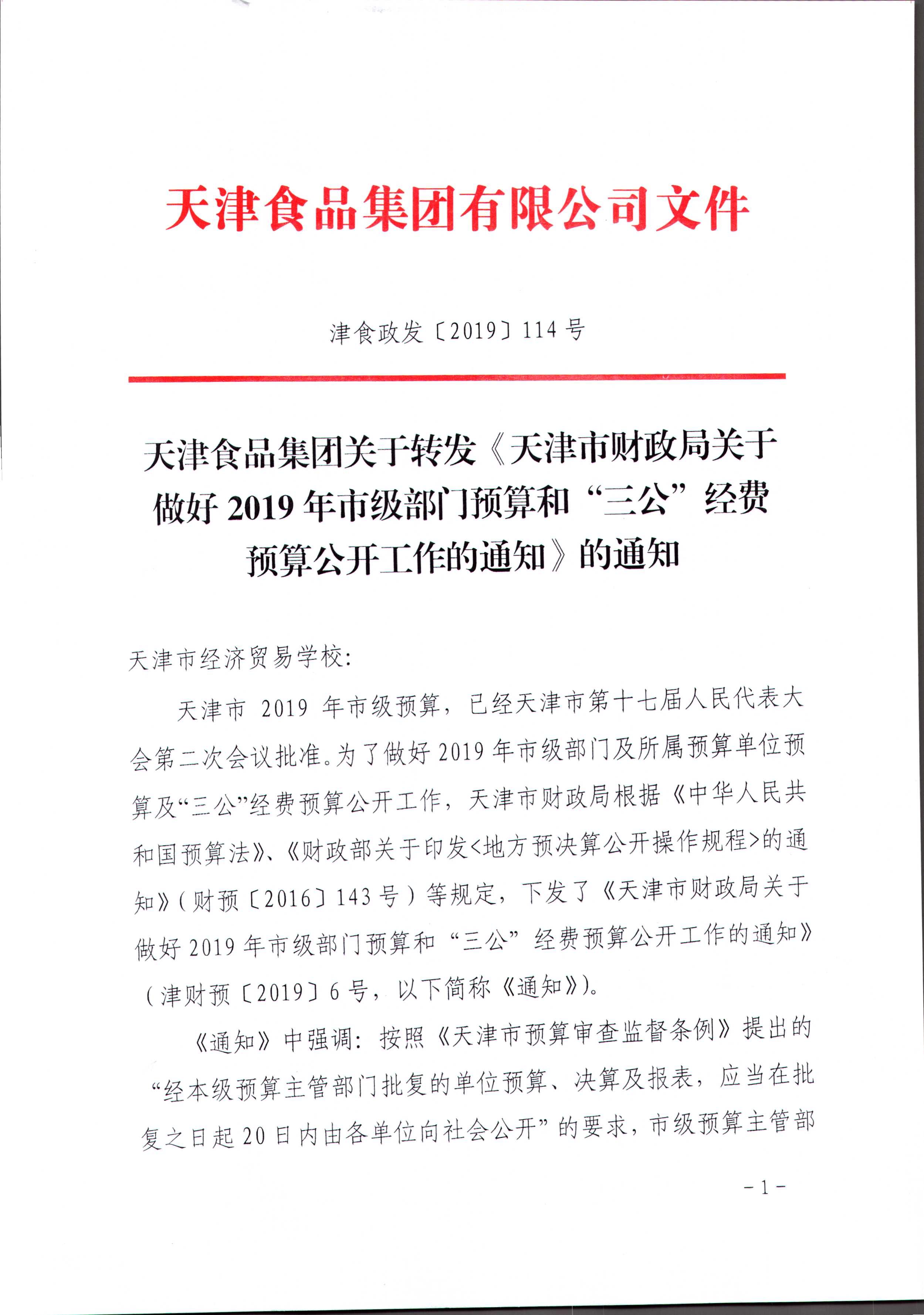 天津食品集團(tuán)關(guān)于轉(zhuǎn)發(fā)《天津市財(cái)政局關(guān)于做好2019年市級(jí)部門(mén)預(yù)算和“三公”經(jīng)費(fèi)預(yù)算公開(kāi)工作的通